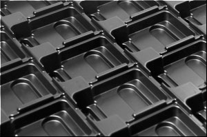 A Polysterene black conductive high impact tray for small and fragile automotive parts used for in-process transfer and product shipment.